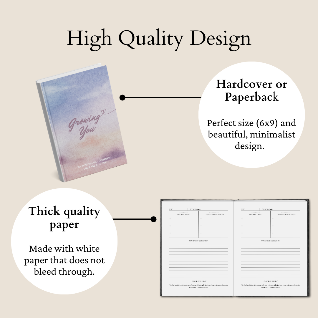 The Growing You Pregnancy Journal is your space to slow down and savor every moment of this incredible journey. From the first flutter to the big arrival, this guided journal helps you capture your thoughts, feelings, and special milestones along the way. With thoughtful prompts, space for letters to your baby, and room for all the little details, Growing You becomes a keepsake you’ll treasure forever.